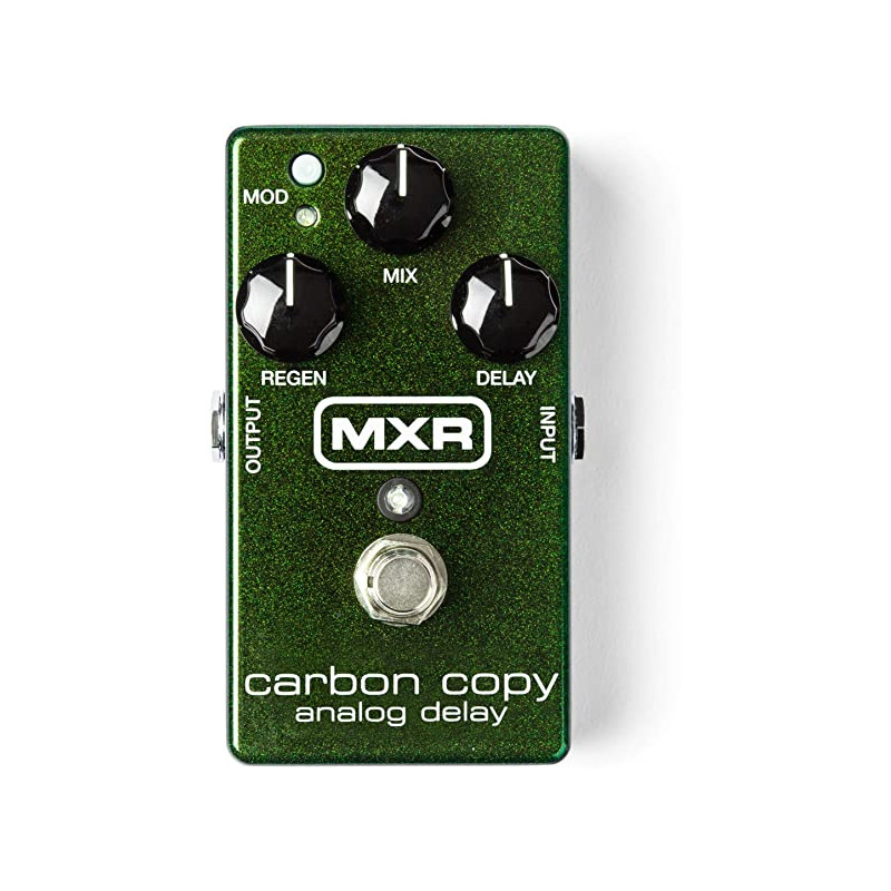 L'M169 Carbon Copy Analog Delay di MXR è dotato di un percorso audio completamente analogico per fornirvi un delay ricco e caldo; questo è possibile solo grazie alla tecnologia "bucket brigade"della vecchia scuola (sviluppata nel 1969 da F. Sangster e K. Teer: il segnale analogico memorizzato viene spostato lungo la linea di condensatori, uno step ogni ciclo di clock). Questo progetto vanta uno straordinario tempo di ritardo (Delay Time) di 600ms con modulazione opzionale selezionabile tramite interruttore e con tre semplici manopole che controllano il tempo di ritardo (Delay Time), la miscelazione dell'effetto (Mix), e la lunghezza dell'effetto (Regen)